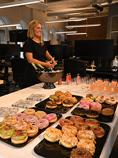Studentene fikk Bellini som velkomstdrink, en goodiebag og ferske doughnuts fra Talormade. Det var veldig god stemning fra det øyeblikket vi åpnet dørene, helt til siste student gikk hjem. Kvelden var fylt med latter og god stemning. Vi åpnet med en velkomsttale, etterfulgt med et foredrag om hvordan det er å jobbe hos oss i TECHPROS. Ronja, Johanne og Malin fortalte om hvordan de kom seg hit, om hvor mye de har vokst og lært de årene de har jobbet her.